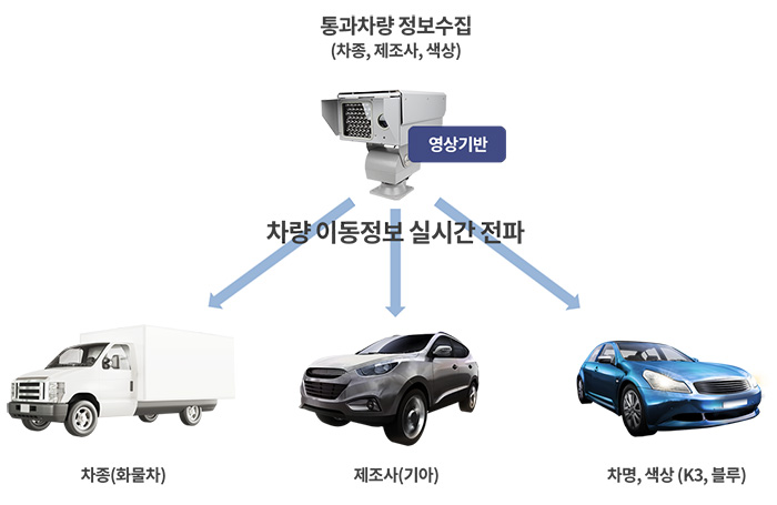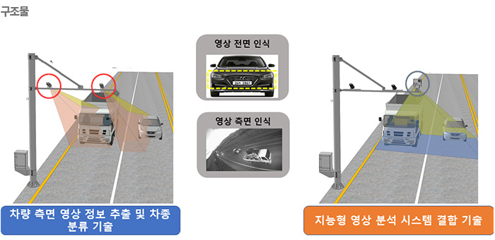 - 이 시스템은 기존 AVC(Automatic Vehicle Classification) 장비의 단점을 극복하고, 4차 산업에서 요구되는 도로 교통량 통계 콘텐츠의 고도화를 달성할 수 있는 새로운 형태의 AVC 장비를 개발하여 비매설식으로 시공이 간편하고 재설치 및 유지 보수가 용이합니다. AI 인식 기술을 기반으로 세부적인 차량 모델을 구분하고, 12종 차종을 분류하며, 1종 세부 구분(택시/경차/그 외), 전기차 분류 등 지능형 차량 분류 정보를 제공하는 시스템입니다.