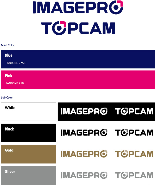 토페스의 브랜드 Topcam과 Imagepro 색상 활용 구정은 토페스 CI와 통일성을 위해 전용 색상은 Blue를 주요 색상으로 하여 Pink를 보조 색상으로 한다. 또한 시그니처 색상의 보조색상 Black, Silver, Gold의 색상을 사용하여, 경제적인 문제나 적용 매체의 특수한 상황으로 인해 별색 사용이 힘들 경우, 또는 다른 재질이나 방법으로 표현하고자 하는 경우 규정을 참고하여 사용한다. 적용시 심볼마크가 시각적으로 배경색에 묻히지 않도록 한다.