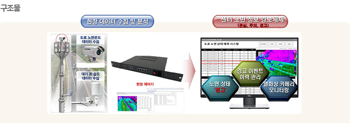- 도로노면 상태스마트 관리시스템(Smart road surface management system)은 도로 결빙 및 안전 취약구간에 설치하여 도로 노면 온도 및 대기 온습도 등 기상 변화로 인한 도로상의 노면결빙 및 Blow UP 가능성을 사전에 예측하여 교통사고 및 사망사고를 예방하기 위한 시스템 입니다.